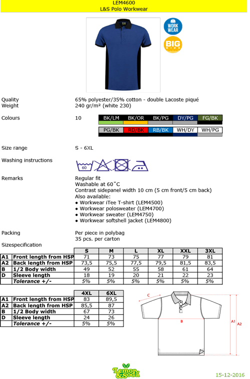 Lemon & Soda Workwear pique contrast poloshirt is dankzij de goede kwaliteit en comfortabele pasvorm met extra lengte erg geschikt als bedrijfskleding voor allerlei beroepsgroepen. Door middel van een bedrukking of borduring is deze polo perfect te personaliseren. De Workwear Contrast lijn is verkrijgbaar in 6 stijlen, 8 maten en 10 kleurcombinaties.